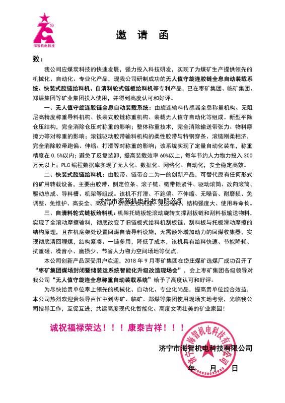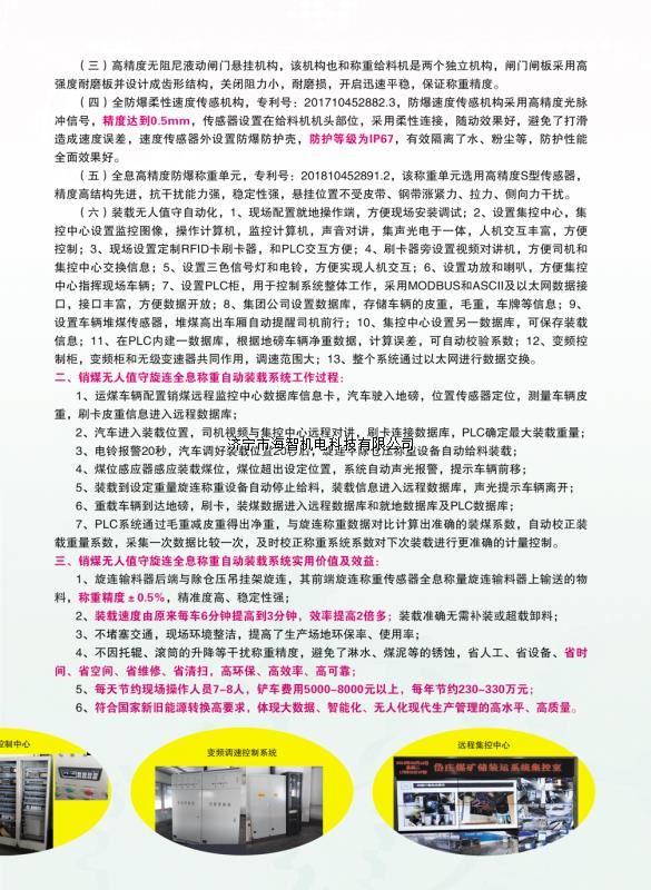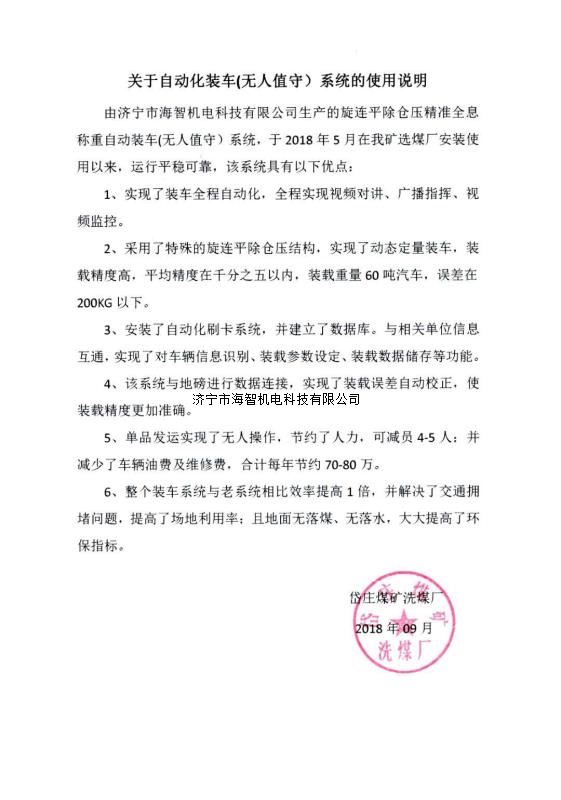 本產(chǎn)品一經(jīng)推出即獲得各大設(shè)計院及用戶的一致好評,率先在棗礦集團(tuán)岱莊煤礦取得成功應(yīng)用,2018年9月受邀參加了《棗礦集團(tuán)煤場封閉暨儲裝運系統(tǒng)智能化升級改造現(xiàn)場會》,智能裝車系統(tǒng)得到了充分肯定!我司憑借雄厚的加工制造實力及過硬的創(chuàng)新技術(shù)能力,勢必為運輸稱重系統(tǒng)、快速計量裝車系統(tǒng)帶來又一次的技術(shù)創(chuàng)新變革。