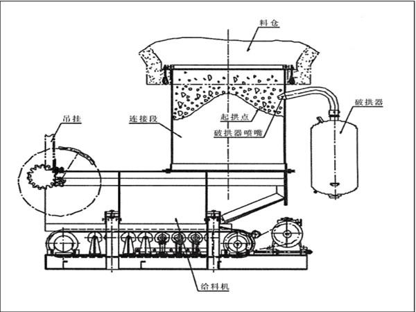自動破拱給料機為了防止在給料機距離倉口較高的時候,連接段內(nèi)的物料壓實粘結(jié)成拱或粘壁,使物料不能從連接段內(nèi)排出或減少連接段的有效容量,因此采用了在連接段上安裝PF系列破拱器。自動破拱給料機利用壓縮空氣時瞬間產(chǎn)生的爆破力,對物料產(chǎn)生爆破、切割效應,以達到良好的疏通效果。